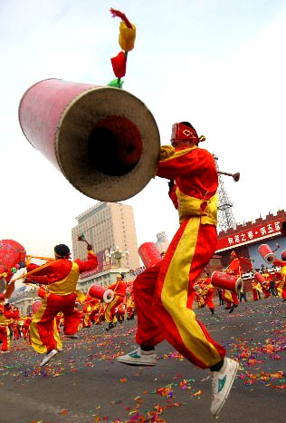 高鼓打花样,中鼓打技巧,低鼓打深沉。当锣鼓响完,鼓手围圆,先打\"鹞子翻身\",一层、二层、三层,层层开花,象征着我们的事业兴旺发达。鼓手们打\"黄河激浪\"时,他们轮番将鼓抛向空中,一层落下,一层又起,大浪滚滚齐头并进,从不同的角度表现黄河汹涌澎湃不可阻挡的气势。其它阵法还有:鹰击长空、响雷惊炸、两军对擂、四门、三阳开泰、铁臂合围、万马奔腾等等。